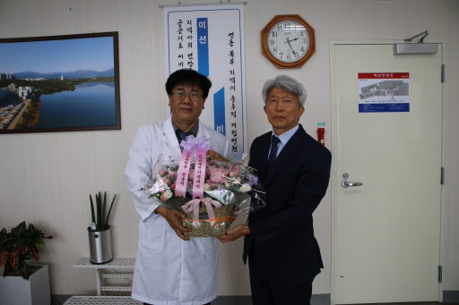 권종석(오른쪽) 강원진로교육원장은 코로나19로 어려움을 겪는 화훼농가를 돕기 위해 '플라워 버킷 챌린지'에 동참, 25일 속초의료원에서 김진백 원장에게 꽃바구니를 전달했다.