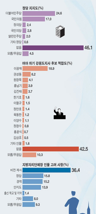 응답자의 42.5%가 13명 중 도지사 후보로 택할 적합한 후보가 없다고 답해서다. '모름·무응답'(10.3%)까지 합하면 무려 52.8%가 선택을 보류하거나 거부했다. 거듭된 여야 공방과 기성 정치인에 대한 피로감이 반영된 것으로 보인다. 아직 2022년 도지사 선거까지 2년여가 남아있는 만큼 도민의 기대가 반영된 새 인물이 나타날 가능성이 있다. 차기 도지사 및 시장·군수를 선택할 때 응답자의 36.4%가 '비전 제시'를 최우선 고려사항으로 꼽았다. 강원도 및 각 시·군의 미래 비전을 얼마나 구체적으로 잘 그려내느냐가 중요한 변수가 될 수 있다.