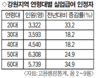 ■시(市) 거주 노인·청년 대거 실직=고용행정통계에 따르면 올 2월부터 9월까지 실업급여 수급자격을 인정받은 강원지역의 인원은 2만3,663명으로 전년 대비 26% 증가했다. 전국 평균보다 2%포인트 낮지만 연령대별 편차가 컸다. 30~40대는 18.2%, 50대는 25% 증가해 평균보다 낮았지만 60대는 35%, 20대는 33%씩 증가해 실업난이 더 심각했다.