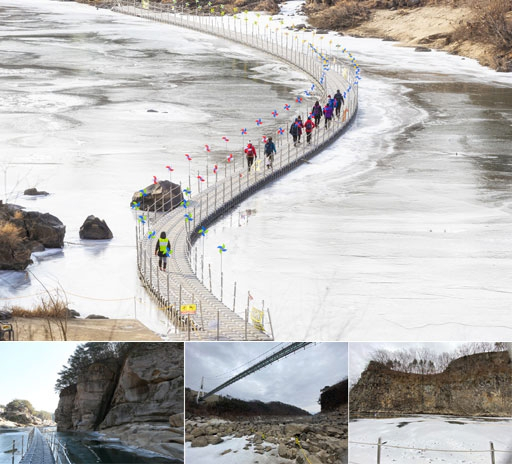 ■태봉대교~철원한탄강은하수교 코스=약 1㎞ 구간의 코스로 부교를 이용해 한탄강 중심으로 향한다. 몇 분을 걸어 뒤를 돌아보면 물윗길의 시작점인 붉은색의 태봉대교가 한눈에 들어온다. 태봉대교 위쪽으로 직탕폭포가 자리 잡고 있다. 최근 추위가 이어지면서 얼어붙은 직탕폭포를 보고 물윗길에 진입하는 것도 좋다. 다시 한탄강은하수교로 길을 잡는다. 양옆으로 늘어선 검은색의 현무암과 열을 맞춰 걷는다. 15분 정도 걷다 보면 한탄강이 자랑하는 주상절리인 송대소를 만난다. 지표로 분출한 용암이 빠르게 식으면서 수직의 기둥 모양으로 남아 한탄강 협곡을 따라 약 30~40m 높이로 만들어졌다. 지층에 따라 붉은색과 검은색, 회색 등 다양한 색으로 남았다. 거대한 수직 절벽에 남은 송대소를 보며 걷다 보면 지난해 개장한 철원의 새로운 랜드마크 철원한탄강은하수교를 마주한다.
