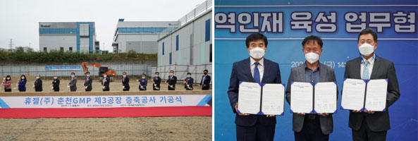 ■강원도의 전폭적인 지원=휴젤의 성장 배경에는 고향인 강원도의 전폭적인 지원이 있었다. 휴젤은 2005년 한림대의 지원으로 창업보육센터에서 둥지를 틀었고 2006년에는 춘천 테크노파크에 제1공장을 설립하면서 본격적인 행보를 시작했다. 2013년에는 거두단지 내 제2공장을 준공했으며 이후 휴젤생명공학 연구소와 공장 설비를 확충함으로써 급격한 성장을 거듭했다. 2020년에는 코로나19 팬데믹에도 불구하고 사상 첫 매출 2,000억원을 돌파하며 최대 기록을 경신했다. 같은 해 국내 기업으로는 최초, 세계에서는 4번째로 중국 보툴리눔 톡신 시장에 진출하는 쾌거를 거뒀다. 올해는 유럽, 내년에는 미국까지 글로벌 빅마켓으로의 잇단 진출이 예상됨에 따라 생산기지 확충에도 힘을 쏟고 있다. 지난 6월에는 거두농공단지 내 HA필러 신공장 준공을 마쳤고 현재는 글로벌 시장 확대를 앞두고 보툴리눔 톡신 글로벌 생산기지인 제3공장 설립이 순항 중이다.