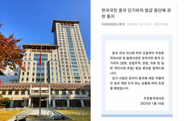 주한중국대사관은 이날 소셜미디어 위챗 공식 계정을 통해 "중국 국내 지시에 따라 오늘부터 주한중국대사관 및 총영사관은 방문, 상업무역, 관광, 의료 및 일반 개인사정을 포함한 한국 국민 중국 방문 단기비자 발급을 중단한다"고 밝혔다.