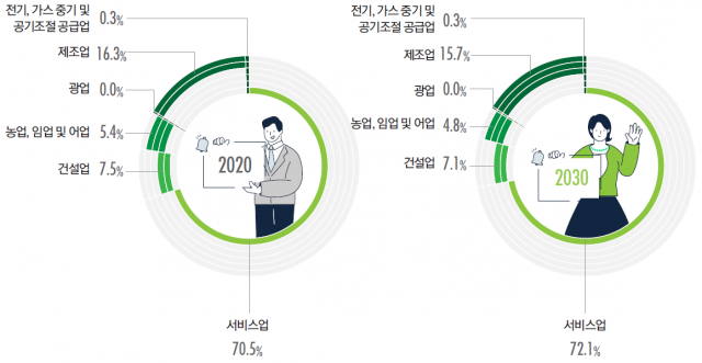 ■사회복지서비스업 늘고 농림어업 줄고=산업별 취업구조를 보면 고용정보원은 보건업·사회복지 서비스업, 과학 및 기술서비스업 등의 서비스업 취업자 수가 전체 취업자에서 차지하는 비중이 2020년 70.5%에서 2030년 72.1%로 확대될 것으로 예상했다.