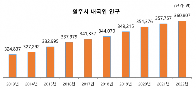 시에 따르면 지난해 말 기준 원주시 내국인 인구는 전년 대비 3,050명 증가한 36만 807명으로 월 평균 254명이 늘었다.
