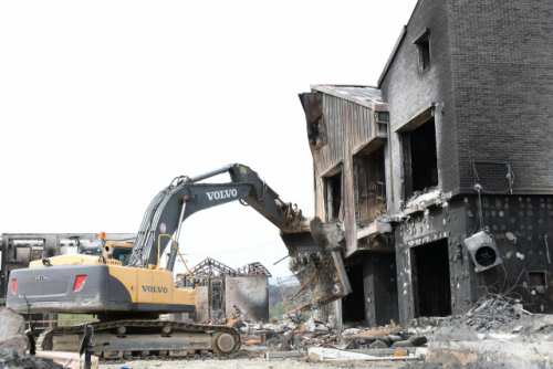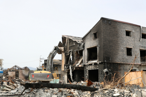 2일 강릉시 안현동과 저동 일대 펜션단지, 단독 농가주택 등 강릉 산불 피해지역 곳곳은 굴착기 등을 동원한 전소 건물 철거 작업이 한창이었다. 작업은 시와 정부의 산불 피해조사를 마친 후 건물 철거에 동의한 이재민 주택과 숙박시설부터 시작됐다.