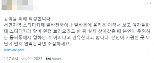 지난 1월 21일 A씨는 소셜미디어 X(전 트위터)에 “공익을 위해 작성한다”며 “알바 구직 사이트에 올라온 이력서를 보고 여자들에게 ‘부산 서면 지역의 스터디카페 알바 면접을 보러오라’고 한 뒤, 실제로는 '본인이 운영하는 룸살롱에서 일하는 거 어떠냐'고 권유한다"라는 내용의 글을 올렸다. 이어 “요새 알바 구하는 갓 20세 된 성인분들 많은데, 또 피해자 생길까 봐 올린다”며 “본인이 지원한 곳 아닌데 먼저 연락이 온다면 조심하라”고 당부했다.
