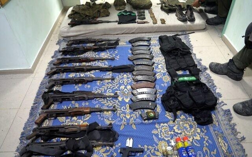 공개된 영상에는 이스라엘 군인들이 옷장 안에서 발견된 천 가방에서 소총과 탄창 등을 확인하는 모습이 담겼다.