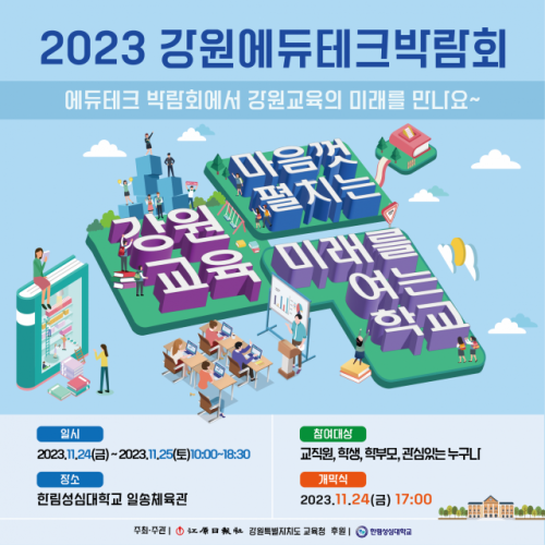 교육과 기술이 결합된 에듀테크의 최신 동향을 확인하고 미래 교육의 방향성을 모색하는 ‘2023 강원에듀테크박람회’가 24, 25일 이틀간 한림성심대 일송체육관에서 열린다. 강원특별자치도에서 처음 열리는 이번 에듀테크박람회는 강원특별자치도교육청과 강원일보가 주최하고 한림성심대가 후원한다.