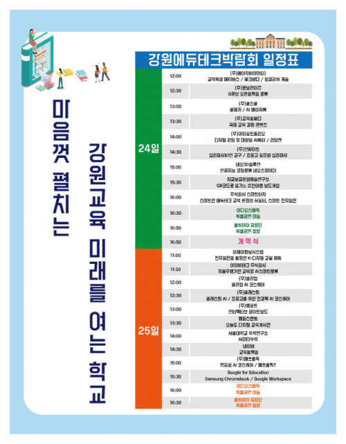 이번 박람회에서는 ‘마음껏 펼치는 강원교육, 미래를 여는 학교’를 주제로 구글과 네이버, 서울대 수학연구소 등 기술력을 확인할 수 있는 70여개 교육기술 홍보부스와 체험 이벤트관, AI 학습 체험관 등이 운영된다. AR/VR/메타버스, 체험학습, 인공지능(AI), 콘텐츠, 교구, 전자칠판 등으로 분류된 홍보 부스에서는 AI, 메타버스, 학습용 로봇, 디지털 교실, 교육학 기반의 혁신적인 교육 기술과 각종 프로그램을 선보인다.