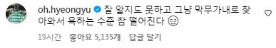 오현규는 지난 14일 자신의 사회관계망서비스(SNS)에 한 누리꾼이 "탁구 재밌게 쳤나. 소속팀에서도 주전으로 못 뛰는 실력이면 말이라도 잘 들어라"라는 댓글을 남기자 "잘 알지도 못하고 그냥 막무가내로 찾아와 욕하는 수준 참 떨어진다"라고 적었다.
