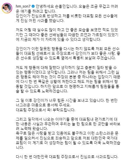 이강인의 사과문 발표 직후 손흥민도 자신의 SNS를 통해 입장을 밝혔다.