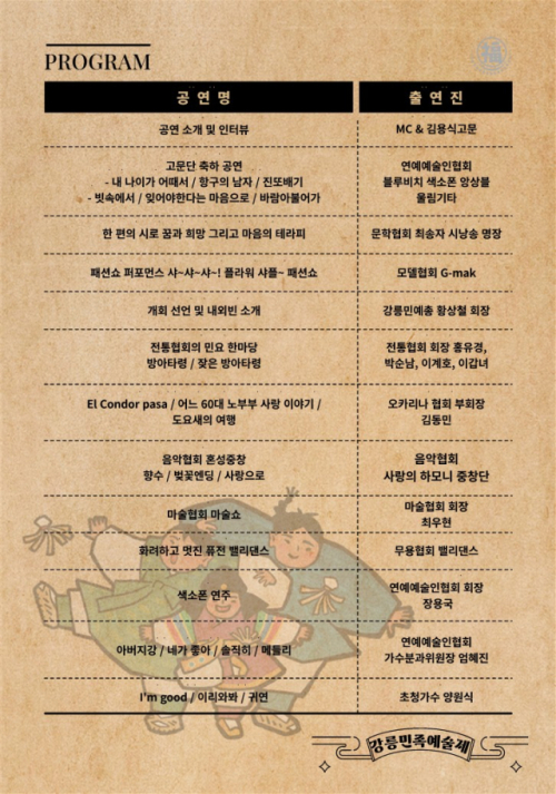 황상철 강릉민예총 회장은 "지역의 예술축제로 지속적이고 발전적인 문화축제가 되도록 노력하겠다"고 말했다.