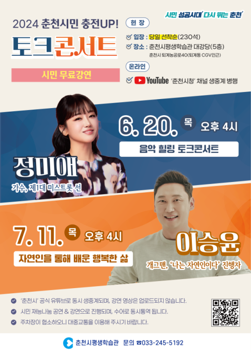 이번 토크콘서트는 수어로 동시 동역되고 시민 누구나 무료로 참석할 수 있다. 당일 230석 선착순 입장 가능하고 춘천시 공식 유튜브로 중계된다.