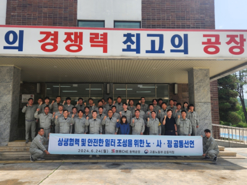 쌍용C&E 동해공장은 24일 고용노동부 강릉지청장을 초빙해 2분기 근경협의회를 진행했다. 이날 위기 극복 및 경영 목표 달성을 위한 노사 한마음 결의대회와 함께 노조 창립 60주년을 맞아 노사가 상생 협력 및 안전한 일터 조성을 다짐하는 공동선언문을 발표했다.