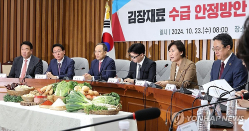국민의힘 한동훈 대표는 "김장철을 앞두고 배추 생육 부진으로 작년 대비 80% 높은 가격이 형성돼 있다"며 "농산물 대책의 경우에 정책을 투입하면 나오는 시차가 상당해서 지금부터라도 해온 걸 점검하고 국민이 걱정하지 않도록 부족한 부분을 점검해야 한다"고 말했다.