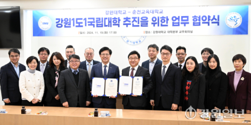 19일 강원대와 춘천교대는 강원대 대학본부에서 정재연 강원대 총장과 이주한 춘천교대 총장 등이 참석한 가운데 ‘강원 1도 1국립대학’ 추진을 위한 업무협약을 체결했다. 이 자리에서 정재연 총장은 빠르면 다음주 중 강원도립대와도 같은 협약을 추진할 예정임을 밝혔다.