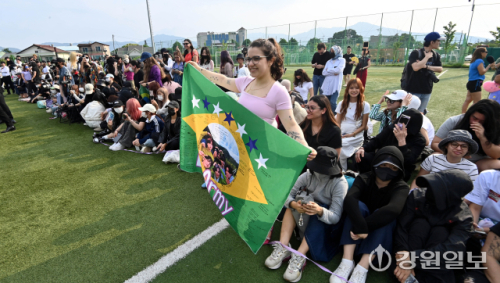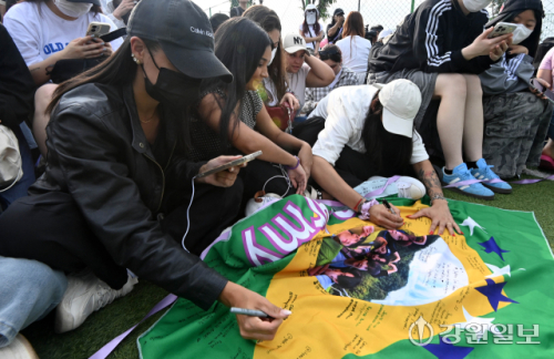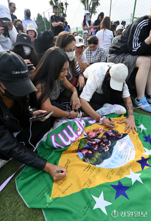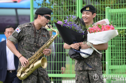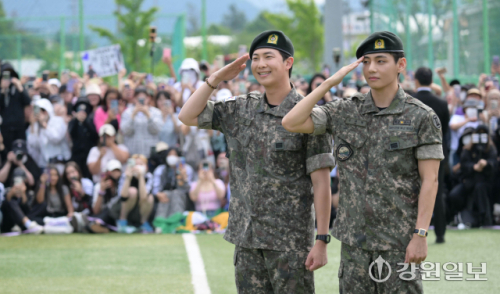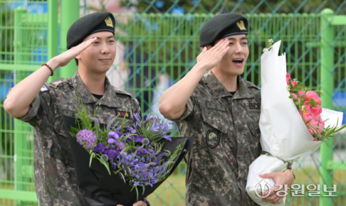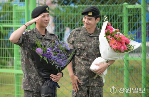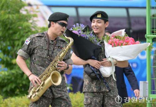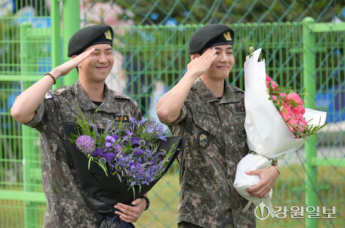 10일 강원지역에서 현역 군복무를 마치고 만기 전역한 BTS(방탄소년단)멤버 '뷔'(김태형)와 'RM'(김남준)이 춘천시 신북읍 체육공원에서 팬들을 만나 인사하고 있다.