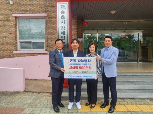 MG새마을금고중앙회 강원지역본부(본부장:천종철)와 속초남부새마을금고(이사장:이태자)는 1일 속초시장애인복지센터에 ‘MG희망나눔 온정나눔 행사’기부금 500만원을 전달했다. 이날 행사에는 천종철 새마을금고중앙회 강원지역본부장, 이태자 속초남부새마을금고 이사장, 손인성 속초시장애인복지센터장 등이 참석했다.