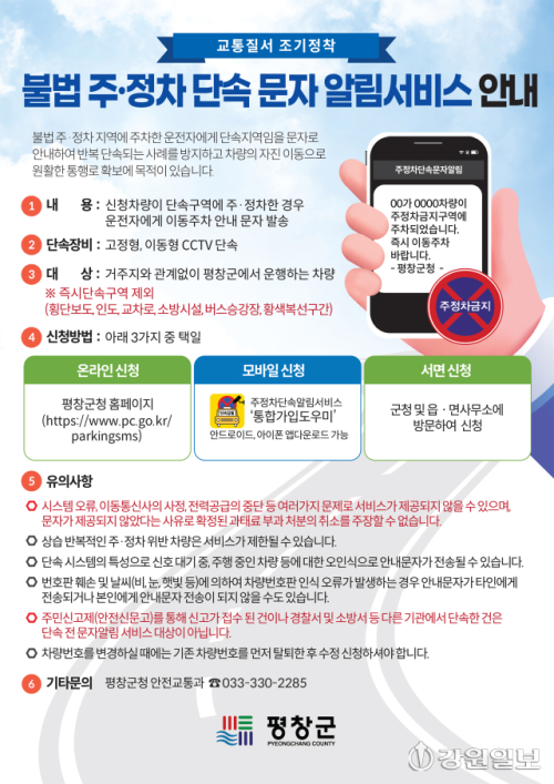 평창군이 서비스 가입을 받아 보내는 불법 주·정차 단속 문자 알림은 지역 내 주·정차 금지구역에 차량이 주정차하는 경우 가입자에게 단속 지역임을 문자로 안내하는 서비스로, 이용자에게 교통 편의를 제공하고 불법 주·정차로 인한 불편도 해소될 전망이다.