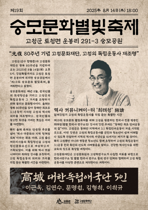 군은 오는 14일 토성면 운봉리 숭모공원 일원에서 ‘2025 숭모문화 별빛축제-동해안 최초 만세운동의 길’을 개최한다.