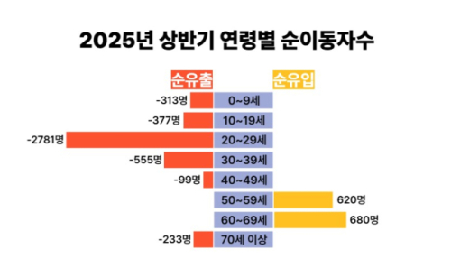 세부적으로 대학 및 군대, 일자리 등의 진로를 위해 4,000여명씩 떠나는 20대(20~29세) 대비 2021년~2022년 순유입된 인구가 많았던 30대(30~39세) 마저도 2023년(-40명), 2024년(-821명), 올 상반기 기준 555명이 순유출 되며 마이너스로 전환됐다.