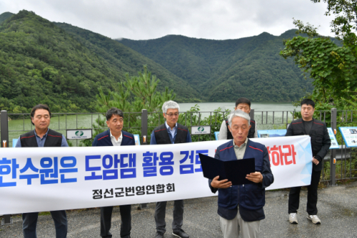 정선군번영연합회는 26일 평창 대관령면 도암댐에서 9개 읍면 번영회장들이 참석한 가운데 ‘지역 간 물 분쟁을 조장하지 말라’는 내용의 한수원 규탄 성명을 발표했다.