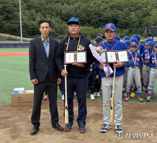 ◇제5회 태백산배 전국 리틀야구대회가 23일 태백 스포츠파크 A구장에서 결승 경기를 끝으로 마무리됐다. 사진 왼쪽부터 김상욱 태백시야구소프트볼협회장, 이성용 경기 부천소사 감독, 백승설 인천 남동구 감독 . 태백=전명록기자