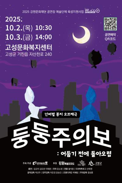 강원문화재단과 고성군의 후원으로 마련된 공연은 추석 연휴 온 가족이 즐길 수 있는 예술의 장을 만든다. 작품은 대사가 없는 ‘넌버벌’ 형식의 오브제극으로 봉지를 활용한 다채로운 움직임을 선사한다. 주인공 지호가 ‘둥둥’이라는 기묘한 존재와 마주하며 느끼는 압박감과 불안, 공포를 극복하는 과정은 김도란·김규리·이태훈 배우의 손 끝에서 새로운 색채를 입는다.