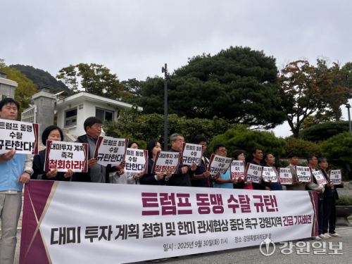 내란청산·사회대개혁 강원비상행동은 30일 강원특별자치도청 앞에서 기자회견을 열고 "미국의 관세협상은 우리나라의 자본, 기술, 노동을 모두 갖다 바치라는 강요”라며 “미국이 한국노동자 300여명을 체포·불법 구금해 내쫒고 3,500억 달러를 현금으로 내놓으라 협박했다"고 강조했다.