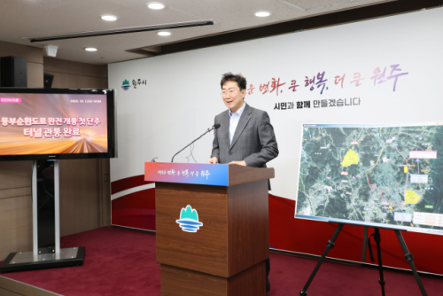 원강수 원주시장은 1일 현안 브리핑을 통해 "동부순환도로 완전 개통의 첫 단추인 봉산동 번재와 소초면 흥양리 구간을 연결하는 터널공사가 지난 30일 관통됐다"고 밝혔다.