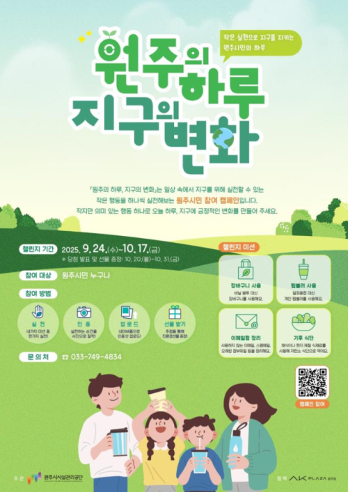 원주시시설관리공단(이사장:조남현)은 최근 단계동 AK플라자 원주점 야외 부스에서 친환경 생활 실천 캠페인 일환으로 '원주의 하루, 지구의 변화' 챌린지를 실시했다. 이번 챌린지에서는 AK플라자 원주점 임직원과 시민 100여명이 참여해 친환경 생활 실천 서약에 서명했다. 챌린지 미션으로는 장바구니와 텀블러 사용, 이메일함 비우기, 기후식단 실천 등이 있다.