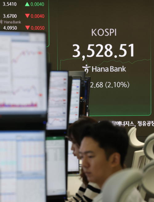 코스피가 장중 3,500선을 돌파한 2일 서울 중구 하나은행 딜링룸에서 딜러들이 대화하고 있다. 2025.10.2 사진=연합뉴스