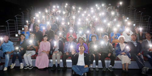 ◇3일 춘천 축제극장 몸짓에서 열린 포토콘서트 ‘덕분에’에서 참석자들이 사진작가 김남덕의 앞날에 행운을 빌면서 휴대전화의 조명을 환히 밝히고 있다. 박승선기자