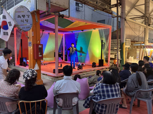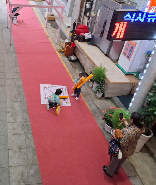 시장 중앙의 큐브스테이지에서는 밴드 라이브 공연과 마술쇼가 열리고, 빈 상가를 활용한 핑크로드살롱에서는 지역 작가들이 협업해 만든 공예품, 디자인 제품이 전시·판매된다.
