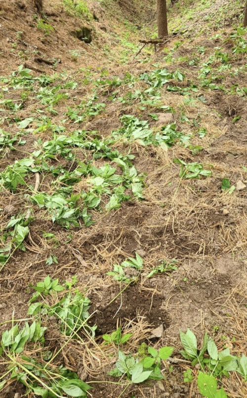 ◇강원 홍천군 화촌면 일대에 야생 멧돼지가 출몰해 땅 곳곳을 파헤치며 산양삼을 먹어 치운 흔적. 사진=독자 제공