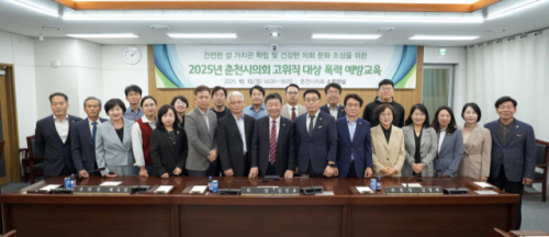 춘천시의회(의장:김진호)는 13일 의회 소회의실에서 시의원, 의회사무국장, 수석전문위원을 대상으로 ‘4대 폭력 예방교육’을 실시했다. 이날 강의는 (사)전국가정폭력상담소협회 공동대표이자 (사)함께하는 누리 대표이사인 최근화 강사가 진행했다.
