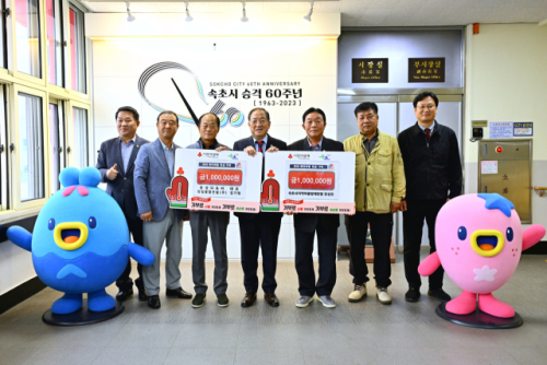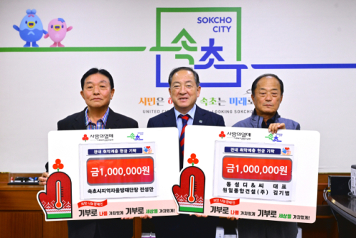 속초시지역자율방재단(단장:전성만)과 동성디&씨(대표:김기범)는 14일 속초시청을 방문, 지역 내 취약계층 지원을 위한 성금을 각 100만원씩, 총 200만원을 기탁했다.