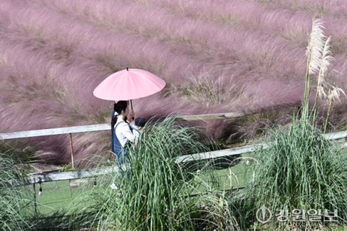 오랜만에 맑은 날씨를 보인 15일 춘천시 신북읍 지내리에서 한 가족이 핑크뮬리와 함께 추억을 남기고 있다.