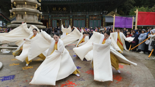 지난 18일은 축제의 상징적 순간들로 가득했다. 월정사 연꽃합창단, 관음사 니르바나합창단 등 불교 합창단이 참여한 오대산 불교합창제가 특설무대에서 화음을 펼쳤으며, 장엄한 불교 의식을 직접 체험하는 부처님 진신사리 이운식이 진행돼 축제의 깊이를 더했다. 이운식에서는 무려 1,500여 명의 참여 신도들이 성보박물관에서 일주문을 거쳐 월정사로 진신사리를 이운하는 동안 삼보일배의 하심(下心)으로 동참했다. 개막식에는 퇴우 정념 월정사 주지스님을 비롯해 김진태 도지사, 유상범 국회의원, 박진오 강원일보 사장, 심재국 평창군수 등 주요 내빈과 합창단, 포교사단, 대학생전법단 등 약 2,000여 명이 참여해 성황을 이뤘다. 개막 공연으로는 전통 한국무용 기반의 동시대적 창작품 ‘오대의 숨(息): 다섯 길’이 펼쳐졌다. 국악과 사운드스케이프가 어우러진 이 작품은 오대산의 다섯 봉우리와 전나무숲 사찰의 시간과 호흡을 몸의 선과 장단으로 풀어내는 ‘공존·치유’의 무용 서사를 선보이며 관객들에게 깊은 인상을 남겼다. 개막식의 대미를 장식한 ‘연결된 온 세상을 위한 화엄 탑돌이’는 축전의 주제를 가장 집약적으로 보여주는 공동체 퍼포먼스였다. 이 탑돌이는 불교 전통 의례를 현대적인 감각과 무대 연출로 재창조한 것으로 인간과 인간, 인간과 자연, 그리고 세계가 상호 의존적으로 연결되어 있음을 형상화하며 호평을 받았다.