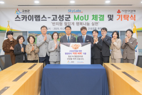 스카이랩스(대표:이병환)는 21일 고성군청 회의실에서 고성군(군수:함명준)과 업무협약을 체결하고 2,750만원 상당의 반지형 혈압계 50개를 기탁했다.