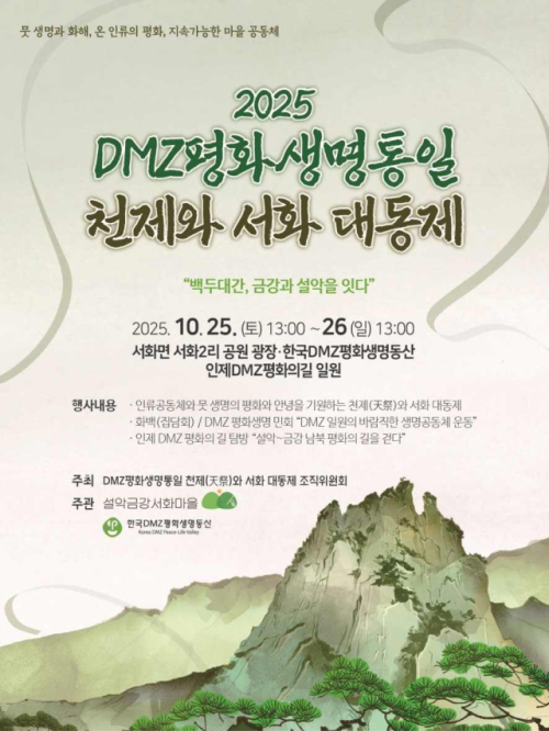 ‘2025 DMZ평화생명통일 천제(天祭)와 서화 대동제’가 25~26일 이틀동안 서화면 서화2리 공원, 한국DMZ평화생명동산, 인제DMZ평화의길 일대에서 열린다.