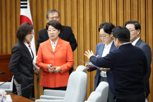 ◇22일 서울 여의도 국회에서 열린 국민의힘 지방선거 총괄기획단 회의를 마치고 나경원 위원장이 의원들과 대화하고 있다. 연합뉴스