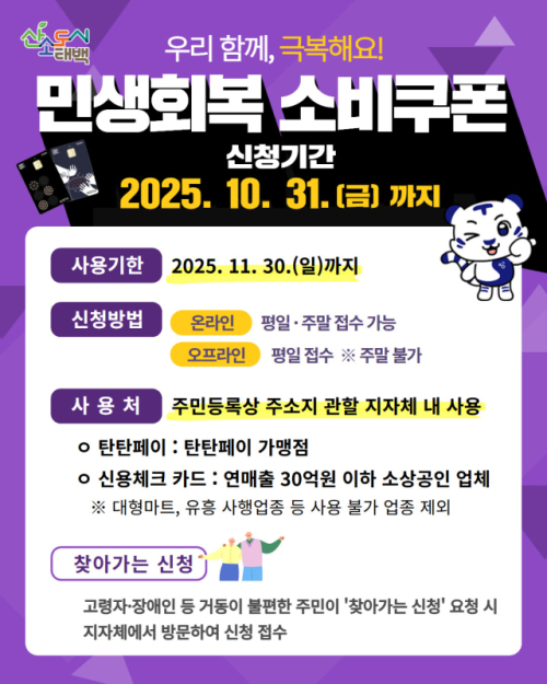 【태백】태백시가 오는 31일로 정부의 2차 민생회복 소비쿠폰 신청 마감일이 다가옴에 따라 미신청 시민들을 대상으로 신청을 당부했다.