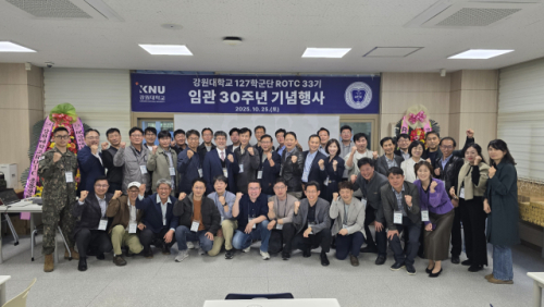 강원대학교 127학군단(ROTC) 33기 임관 30주년 기념행사가 25일 모교 두리관에서 열렸다. 이날 행사에는 동기 70명 중 60명과 현 후보생 등 100여 명이 참석해 지난 시간을 되새기며 우정을 나눴다.