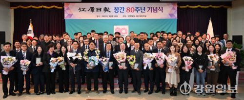 강원일보 창간 80주년 사내 기념식이 24일 오전 강원일보사 4층 대강당에서 박진오 사장을 비롯한 임직원 100여명이 참석한 가운데 열렸다. ‘함께 걸어온 80년, 함께 열어갈 100년’을 슬로건으로 열린 기념식에서 임직원들은 강원일보의 지나온 80년을 기념하고, 새로운 여정의 결의를 다졌다. 이날 기념식에서는 35년간 근속한 김현철 디지털미디어본부 이사와 박준선 경영지원실 CTP부 국장대우를 비롯한 장기 근속 사원 20명에 근속패와 기념품이 수여됐다.