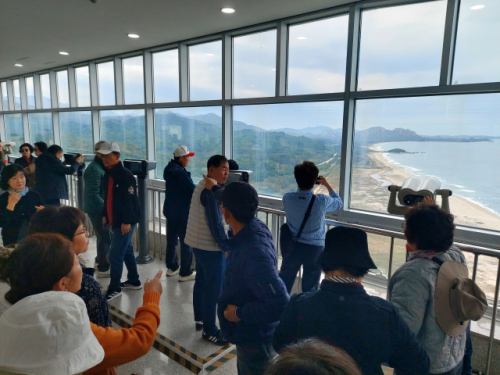 고성 지역에 연일된 비가 소강상태를 보인 26일 휴일을 맞은 관광객들이 고성 통일전망대를 찾아 금강산과 구성봉, 해금강 등을 관람했다.