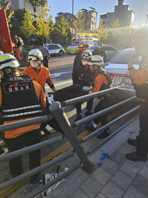 경찰·소방당국에 따르면 지난 24일 오전 7시48분께 춘천시 옥천동의 한 미술관 앞 횡단보도에서 A(16)군이 승용차에 치였다. 차량은 A군과 도로 옆 펜스를 들이받은 뒤 경사로를 따라 미끄러져 내려오며 쓰러진 A군의 다리를 올라탔다. 이 사고로 A군은 허리와 무릎 등을 크게 다쳐 병원에서 치료를 받고 있다.