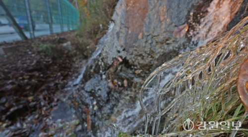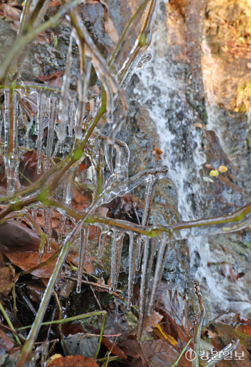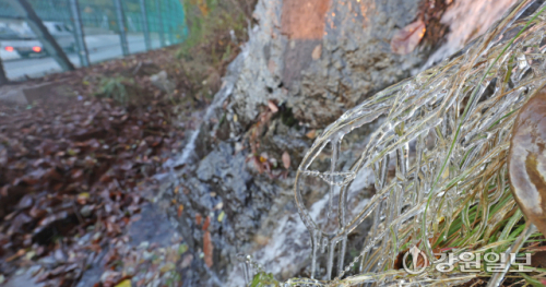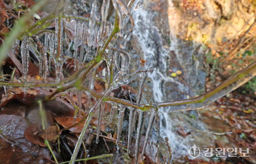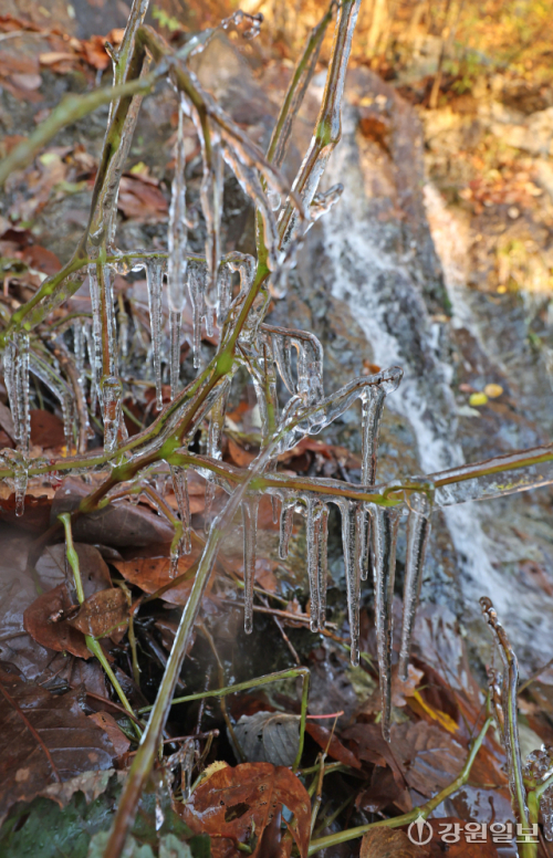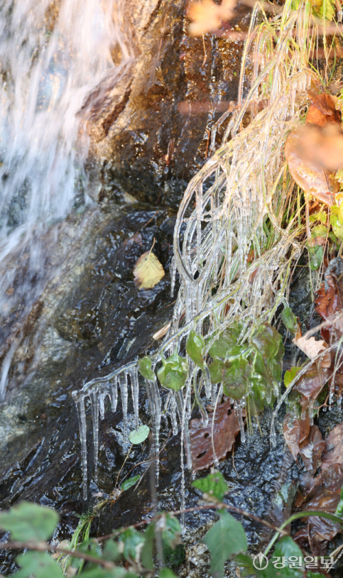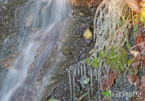 도내 산지의 아침 최저 기온이 영하 7.8도까지 떨어진 28일 강릉시 성산면 옛영동고속도로 대관령 정상의 계곡에 첫 얼음이 얼어붙어 추위를 실감케 한다. 강릉=권태명기자