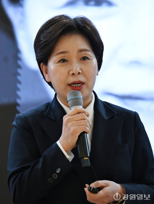 29일 원주의료기기산업진흥원에서 열린 '2025 강원특별자치도 반도체포럼'에서 양향자 국민의힘 반도체·AI 첨단산업특별위원장이 기조강연을 하고 있다. 원주=박승선기자