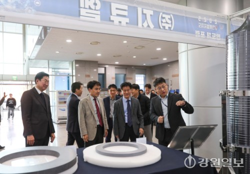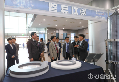29일 원주의료기기산업진흥원에서 열린 '2025 강원특별자치도 반도체포럼'에 참석한 김진태 도지사와 박진오 강원일보사장, 원강수 원주시장 등이 대학 연구자료 전시물을 살펴보고 있다. 원주=박승선기자